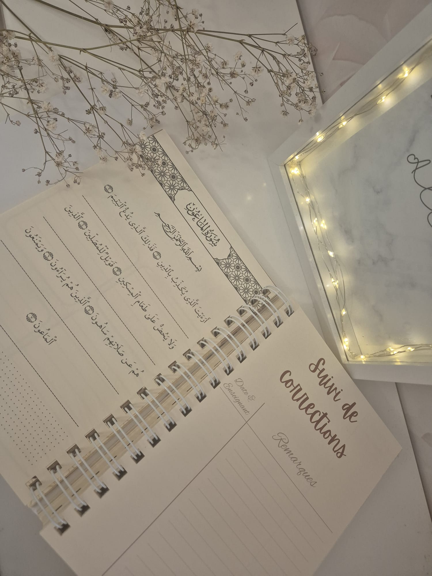 J'en avais eu un lorsque je mémorisais le Juzz Amma pour le tafsir ça m'avait beaucoup aidé, mais il n'était pas aussi complet car là il y a aussi le suivi des corrections de Tajwid ce qui n'est pas négligeable ! Et beaucoup de pages d'écriture pour écrire ce qu'on ressens en lisant les versets etc ...